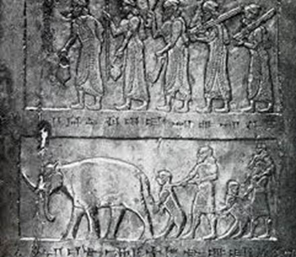 The black Obelisk of Shalmaneser shows an adult elephant (based on the size of the tusks) with a lion/human hybrid and people who are taller than the elephant